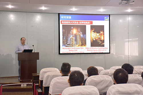 胡隆华以“高层建筑火灾安全挑战与外立面开口火溢流动力学前沿科学问题”为题,将报告分为了四个主要内容。首先,胡隆华教授从近年来国内外高层建筑火灾案例出发,重点介绍了高层建筑的火灾危害性,指出高层建筑火灾安全是一个世界性挑战问题;其次,剖析了高层建筑火灾安全的致灾链和防灾策略,并从阻燃型保温材料、建筑火灾发展规律与阻隔技术、以及高层建筑火灾监测预警、人员疏散等角度分别展开,宏观介绍了应对这一挑战性难题亟需开展的科学研究;第三,分享了近些年中国科学技术大学课题组关于外立面开口火溢流动力学的系列研究工作;最后提出了高层建筑火灾安全的前沿科学问题与展望。