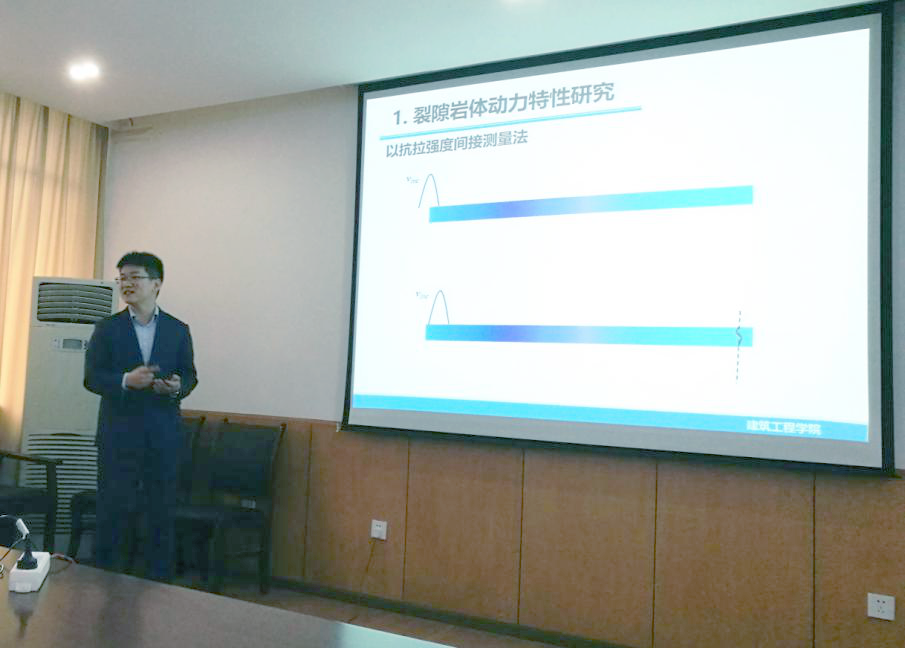 范立峰教授以“裂隙岩体中的应力波传播研究”为主题,以“波”的定义为出发点,别出心裁的把听众从“水波“引入到“应力波”的领域。基于试验和解析方法,他首先对比了完整岩体和裂隙岩体的宏观动力学行为,归纳出节理对应力波传播行为的影响;接着对比分析了宏观节理和微裂隙对应力波衰减的不同影响,在采用不同模型计算的基础上,提出了具有创新意义的、同时考虑节理和微裂隙效应的双模量应力波传播模型;然后采用数值流行法对该模型进行了运用,并和某实地监测项目进行了对比研究。最后,范立峰教授还对热力耦合作用下的岩体动力学特性进行了探讨。