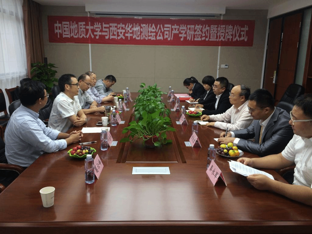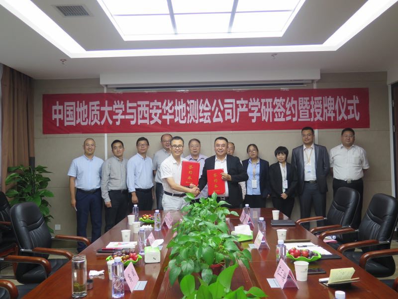 2019年9月15日-9月17日,Beat365中文官方网站(武汉)Beat365中文官方网站党委副书记江广长、副院长窦斌、勘察与基础工程系主任卢春华、姚爱国教授、院工会主席蔡记华教授及工程地质与岩土工程系葛云峰副教授一行赴西安,先后走访了陕西西探地质装备有限公司和西安华地测绘科技有限公司,并与陕西西探地质装备有限公司召开了产学研合作基地揭牌仪式,与西安华地测绘科技有限公司签订了产学研合作协议并进行揭牌。