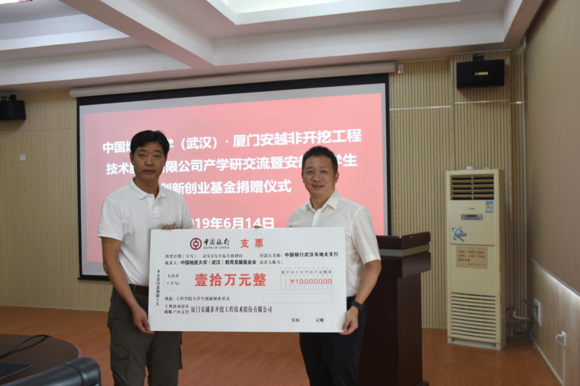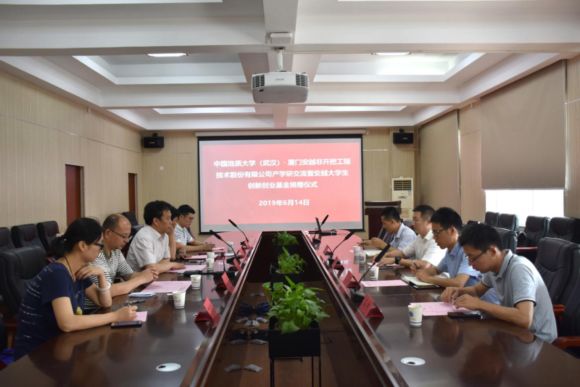 2019年6月14日上午,厦门安越非开挖技术股份有限公司来校作产学研交流,并捐赠10万设立安越大学生创新创业基金,捐赠仪式在315举行。厦门安越非开挖技术股份有限公司董事长廖宝勇一行、武汉中地大非开挖研究院有限公司总经理孔耀祖,校友工作与教育基金管理处副处长吕占峰、丁苗苗,Beat365中文官方网站党委书记陈飞、党委副书记江广长、副教授曾聪参加会议。江广长主持会议。