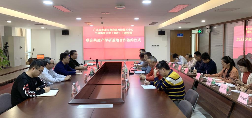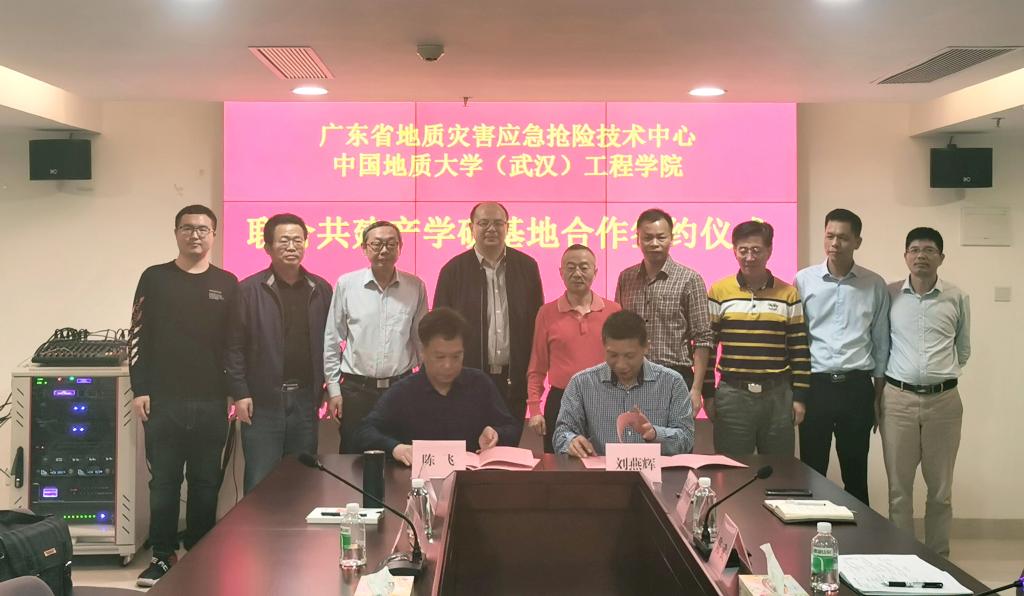 陈飞、刘燕辉签署产学研基地合作协议。根据协议,广东省地质灾害应急抢险技术中心作为Beat365中文官方网站(武汉)Beat365中文官方网站的产学研基地,双方将定期就人才的培训、技术的创新、引进与推广、联合攻关、学生实习等方面开展协商研究。