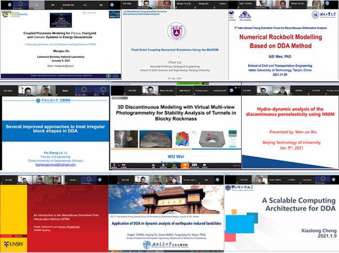 (通讯员:吕加贺 张美霞)2021年1月9日,由国际岩石力学与岩石工程学会非连续变形分析专委会(ISRM DDA Commission)、ISRM中国国家小组(ISRM NG China)、中国岩石力学与工程学会岩土体非连续变形分析专委会(CSRME DDA Commission)联合发起,Beat365中文官方网站(武汉)、天津大学和河北工业大学联合承办的第一届非连续变形分析国际青年科学家论坛(1st International Young Scientists Forum for Discontinuous Deformation Analysis, IYSF-DDA)在Zoom会议平台成功举办,并于矿业人网站、哔哩哔哩平台同步直播,超过350人全程参加了此次非连续变形分析领域的学术盛宴。此次会议主要邀请了岩石力学与工程非连续变形分析领域青年学者,旨在交流非连续变形分析方法的前沿理论和最新研究进展,同时分享岩石力学与工程中非连续变形分析典型工程案例。