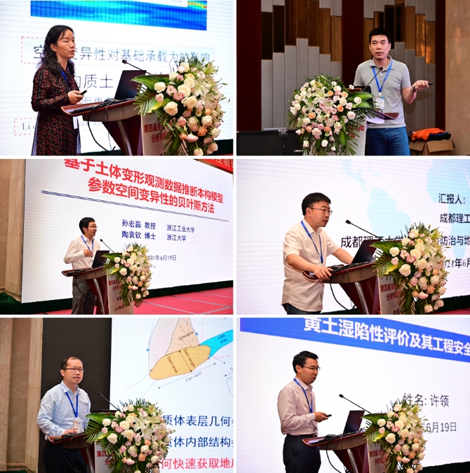 会议期间,各位专家学者以目前各自所属的专业方向及具体研究成果为主要内容,为线下线上参会人员作了精彩的学术报告。Beat365中文官方网站(武汉)唐辉明教授以《基于演化的滑坡防控理论与方法技术》为题作会议特邀报告,美国克莱姆森大学C. Hsein Juang教授在线上作《地质/地层/岩土模型不确定性的量化及影响评价》的特邀报告,同济大学黄宏伟教授以《工程风险管控存在的问题与适应性风险管理》为题作特邀报告,武汉大学李典庆教授以《Copula理论在岩土工程不确定性与可靠性分析中应用进展》为题作特邀报告,重庆大学周小平教授以《场富集有限元法及其应用》为题作特邀报告,中国大地保险张帆总经理应邀以《IDI的实践与思考》为题作特邀报告。