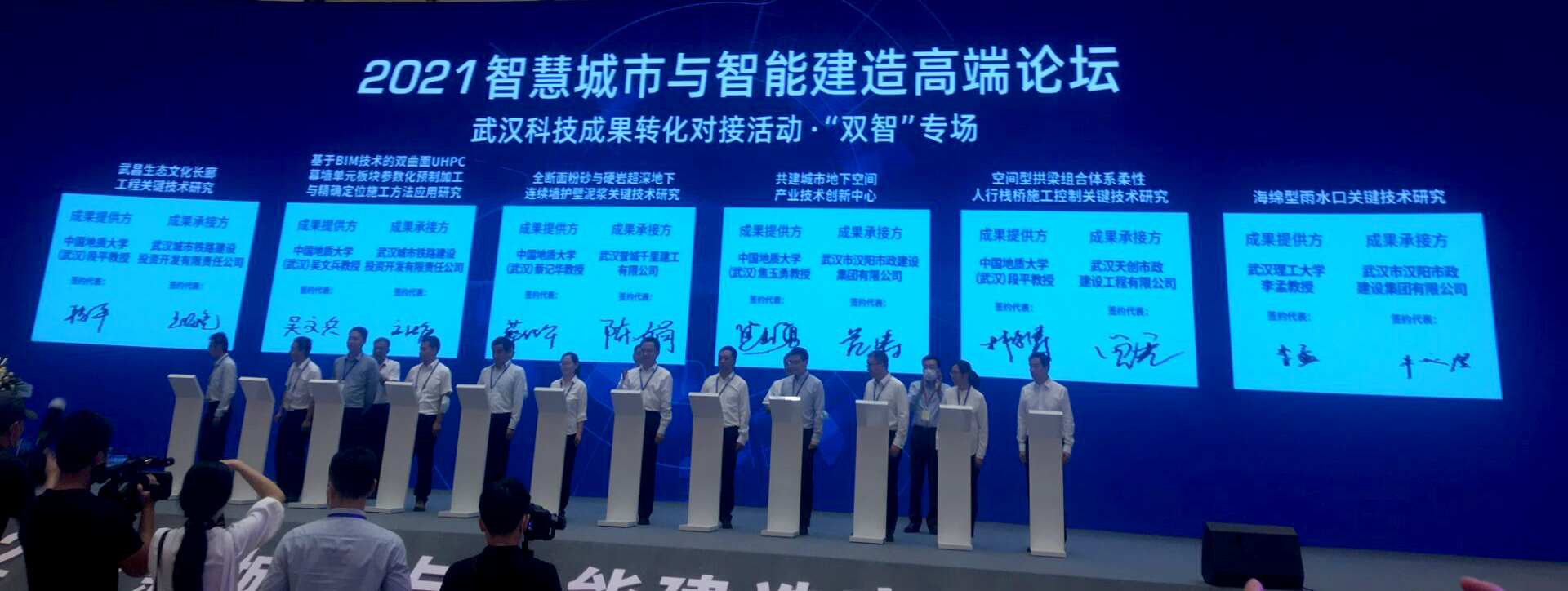 (通讯员:刘浩、张美霞)9月24日,Beat365中文官方网站院长焦玉勇教授应邀率队出席2021智慧城市与智能建造(“双智”)高端论坛。开幕式“武汉科技成果转化对接活动 双智专场”上,焦玉勇带领我院蔡记华、吴文兵、林俊涛、刘浩4位老师分别与武汉市汉阳市政建设集团有限公司、武汉市誉城千里有限公司、武汉市城市铁路建设投资开发有限公司签订了共建技术创新中心、人才培养与科技成果转化合作协议。我院与武汉市相关部门和企业开展深度合作,将为湖北省“一主引领、两翼驱动、全域协同”的区域发展布局,和武汉建设“宜居城市、韧性城市、智慧城市、绿色城市、人文城市”的重大需求提供技术和人才支持。
