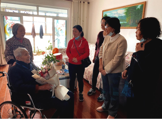 2021年10月29日中午,师生党员和入党积极分子一行十余人来到喻家山庄,看望Beat365中文官方网站退休教师杨金丹教授和刘兴敏教授夫妇。学生党员为两位老教授敬献鲜花。大家亲切交流,握手问安,拉家常,话教育。师生们关切询问他们的退休生活和身体状况,叮嘱他们保重身体,保持与学院的联系,同时送上慰问品,向他们表达了亲切慰问和美好祝愿。
