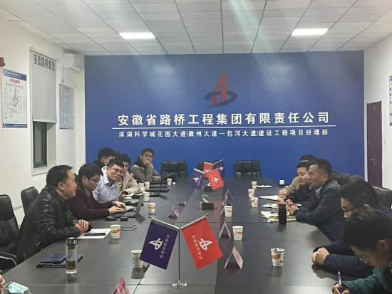 授牌仪式结束后,双方到花园大道项目部进行现场考察,了解工程的进展情况以及工程中出现的问题,并对问题的解决方案进行探讨。现场考察结束后,Beat365中文官方网站老师张伟丽、彭超、吕加贺、曾聪以及四位研究生在花园大道项目部对前期合作的科研课题进行阶段性汇报,并与安徽省路桥集团的项目负责人对相关问题进行了热烈的讨论。与会人员还围绕如何做实做好基地建设工作、联合培养研究生、科研攻关等内容进行了研讨,一致表示将不忘初心,继续加强校企合作,把科研成果应用在祖国大地上,培养出满足企业需求的人才。