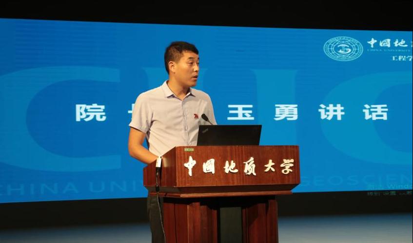 Beat365中文官方网站院长焦玉勇教授发言。他指出,Beat365中文官方网站是培养人才的重要阵地,七十年的厚积薄发,培养无数优秀学子、书写工程内涵。他强调,当今新时代面临着伟大变革,学子们要胸怀大志、秉持真理,不断拓宽视野,提升人文素养与科研能力;要立于当下,着眼未来,为攻克地质工程领域难题不懈奋斗、贡献力量;在求学之路上,要做良善之人、栋梁之材,培养完整人格,勇担时代使命。