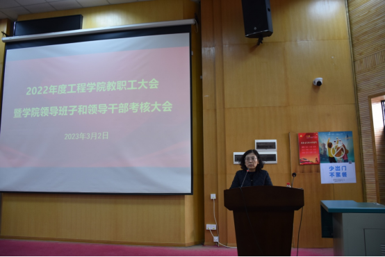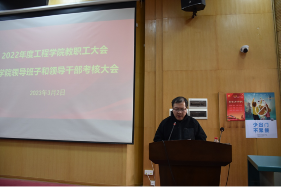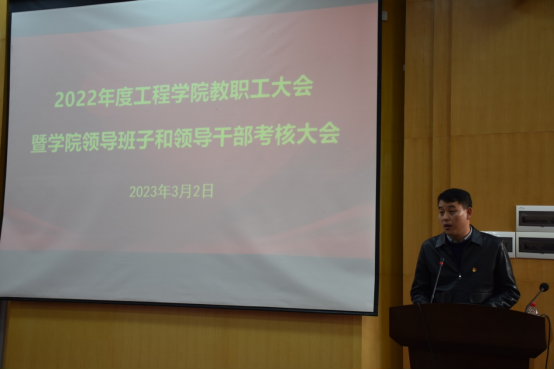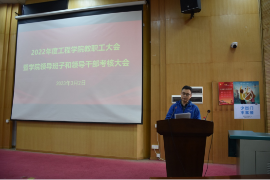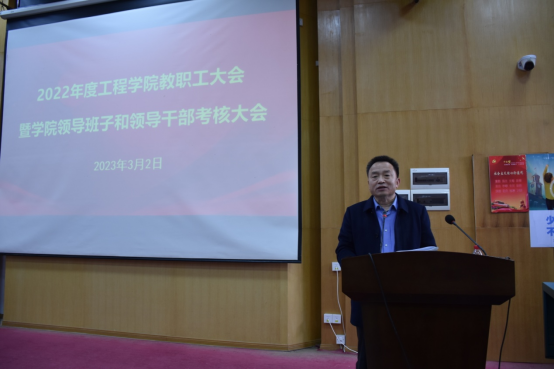 院党委副书记、院长焦玉勇作学院工作报告,代表学院领导班子从党建工作、学科建设、人才培养、科学研究等方面汇报了学院的工作情况和亮点成果,他重点向全院教职员工介绍了2022年学院科研项目取得的突出成果,全年合同经费增涨了72.6%,到涨经费增涨了26.7%,全院形成了浓厚的科学研究氛围。他强调,全院要继续凝聚合力、齐心协力推动学院更好更快发展,努力续写学院新的辉煌。
