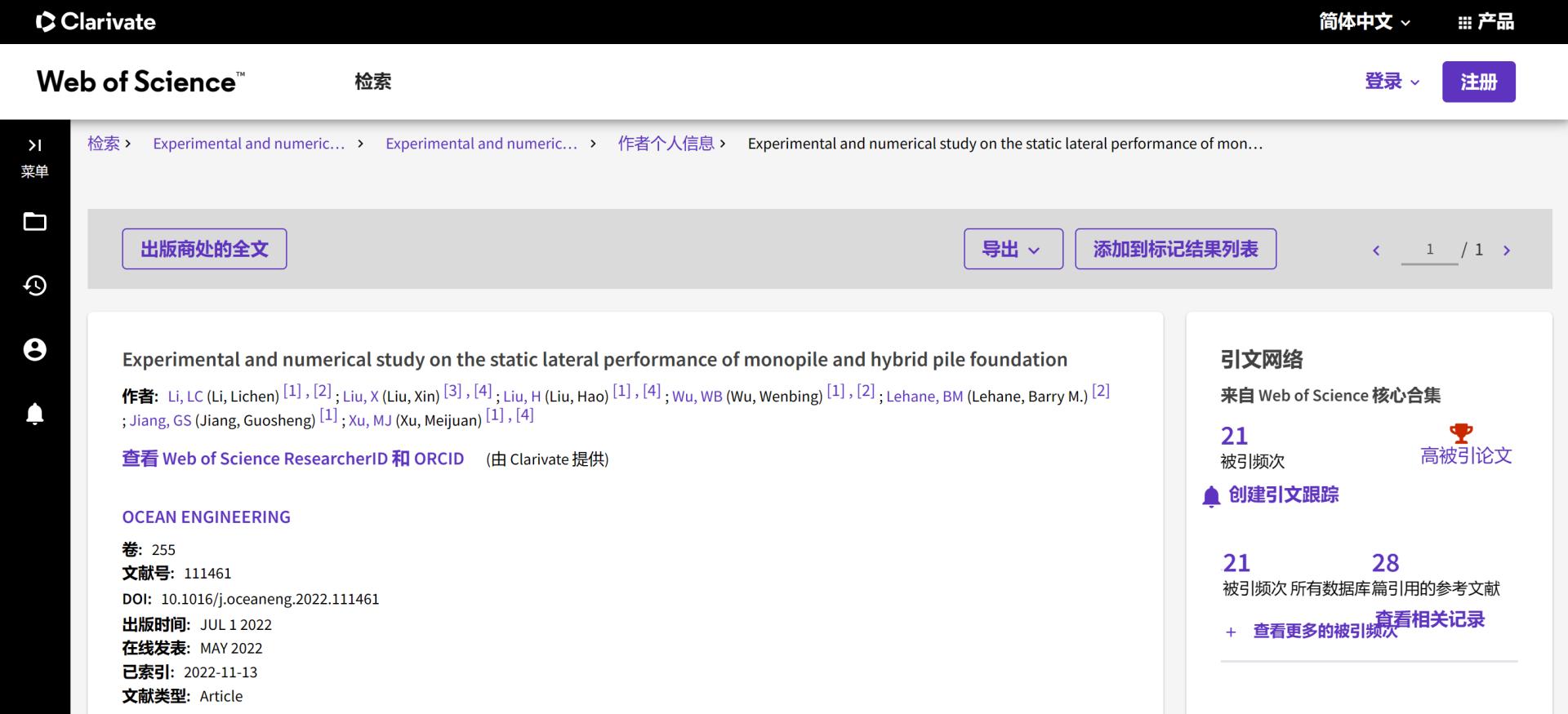 (通讯员 吴文兵)根据2023年6月基本科学指标数据库(Essential Science Indicators,简称ESI)最新数据显示,Beat365中文官方网站勘察与基础工程系蒋国盛教授团队于2022年在国际海洋岩土领域权威期刊Ocean Engineering上发表的学术论文“Experimental and numerical study on the static lateral performance of monopile and hybrid pile foundation”入选ESI高被引论文。该论文第一作者为勘察与基础工程系博士后李立辰,通讯作者为吴文兵教授,Beat365中文官方网站(武汉)Beat365中文官方网站为第一署名单位。