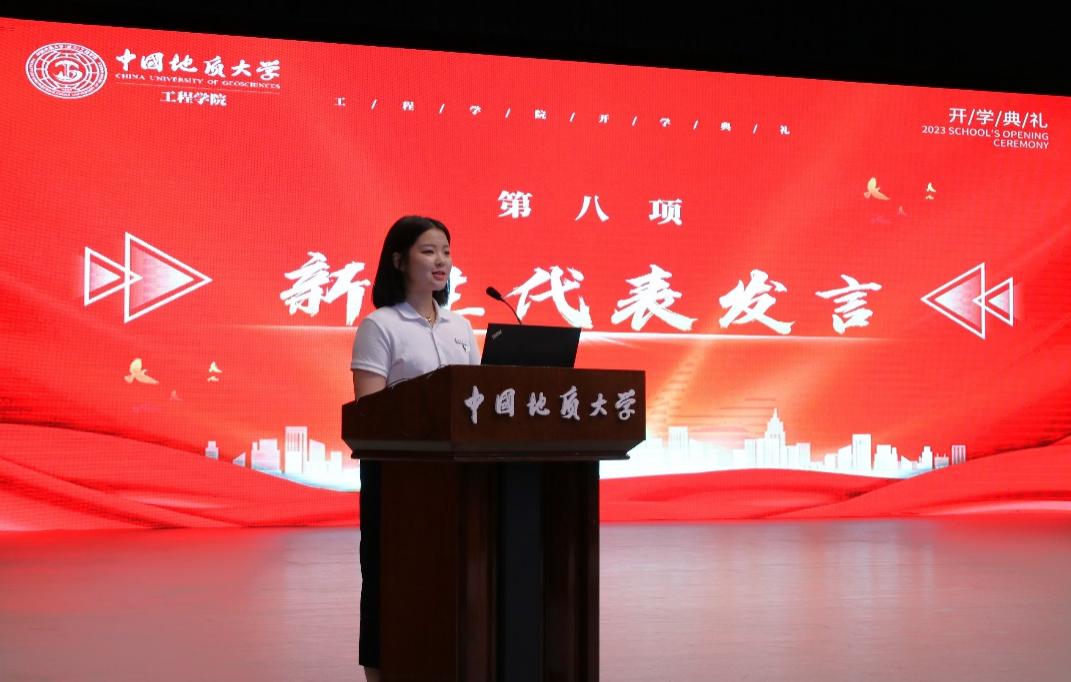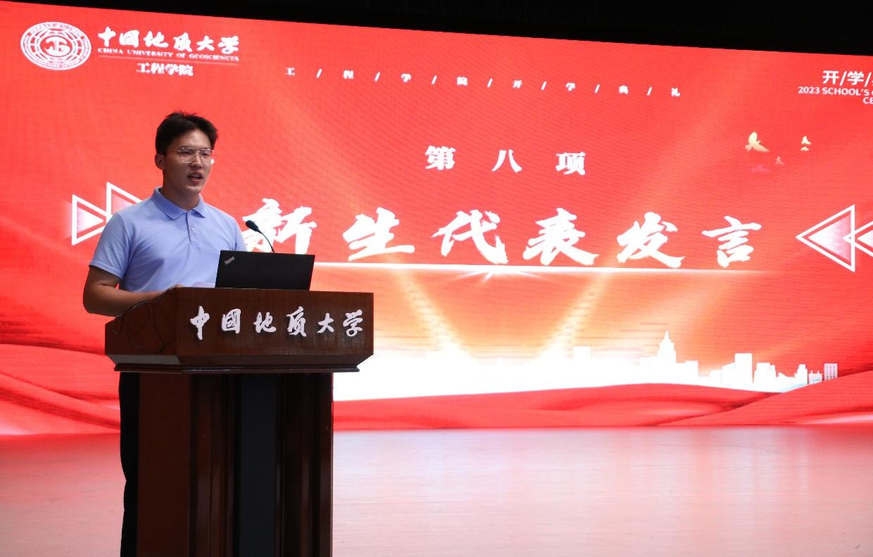 2023级05D231班张高涵同学作为本科生新生代表发言。他说,在长辈厚重岩土气息的熏陶下,自己终于如愿考进地质大学,加入Beat365中文官方网站。他对开学报到以来学院领导老师给予的教育关怀表示感谢,对军事训练当中空军预警学院教官对自己坚忍毅力和良好作息的打造由衷感激,他立志与其他505名本科新生同学一道,以强国建设、民族复兴的时代号召为号角,以“品德高尚、基础厚实、专业精深、知行合一”的成才目标为向导,直挂云帆,乘风破浪,早日成为德智体美劳全面发展的中国特色社会主义事业的建设者和接班人。