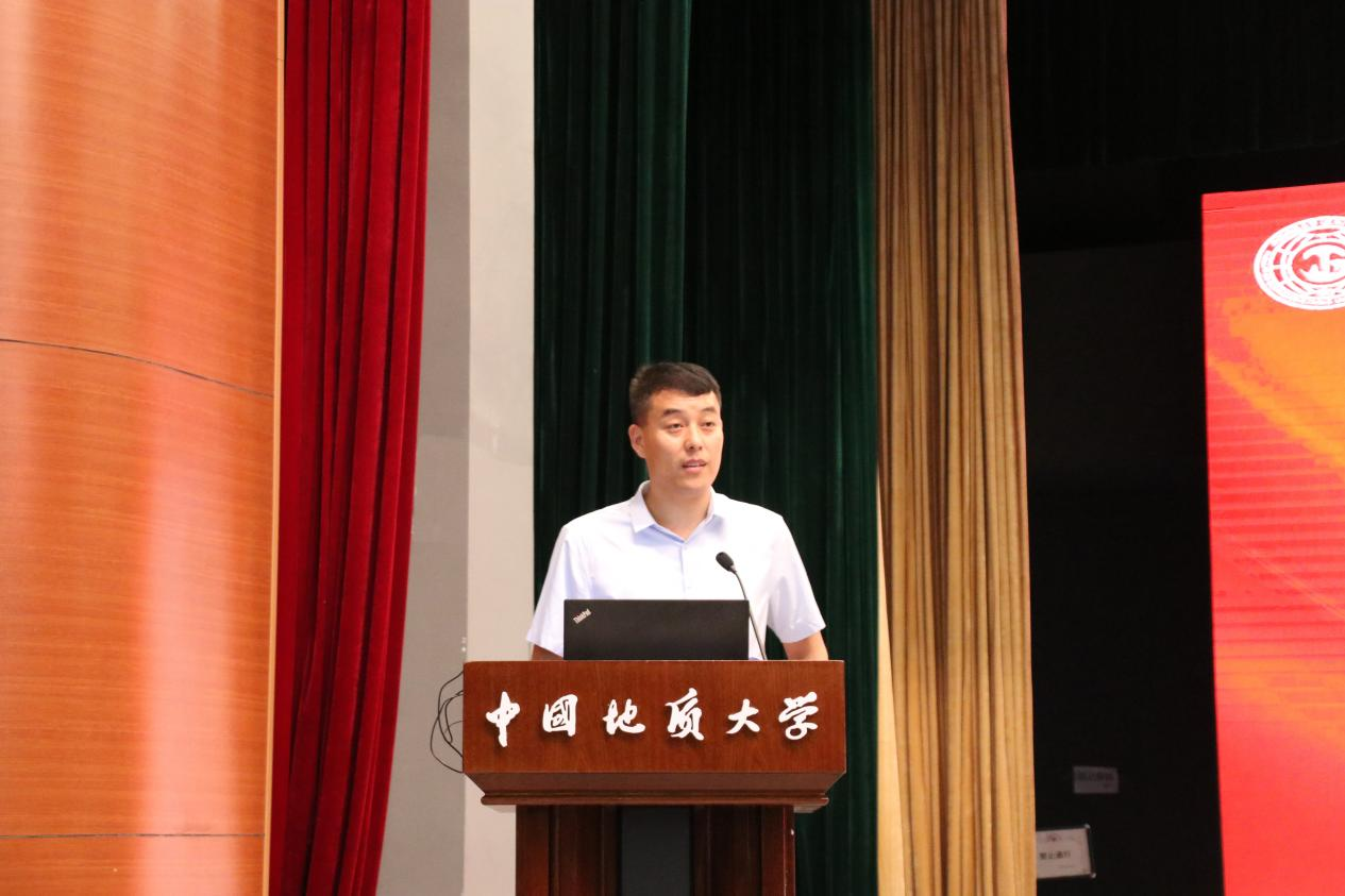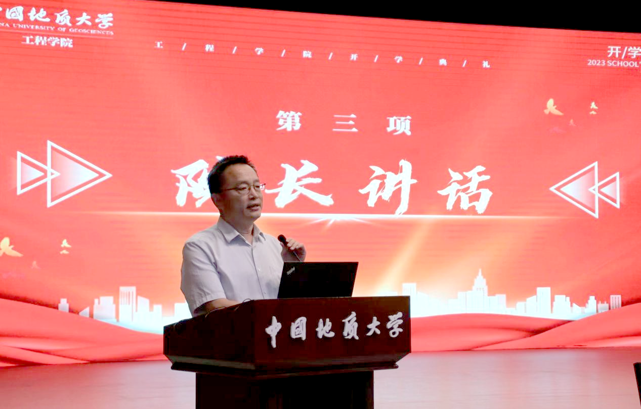 Beat365中文官方网站院长焦玉勇教授讲话。他以“祝贺”“欢迎”“希望”寄语新生,祝贺860位新生加入国家工程行业,欢迎同学们来到Beat365中文官方网站Beat365中文官方网站,为学院发展注入新鲜血液、增添奋进力量。他系统全面的向大家介绍了学院的历史沿革、系室设置、师资力量、学科建设、科学研究、国际交流等基本情况,勉励全体新生用习近平新时代中国特色社会主义思想凝心铸魂,用“艰苦朴素,求真务实”的校训精神和“明理尚实、拓新砺行”的院训精神领航前进,跟随学校学院的发展步伐,用好学校学院的发展平台,毅然投身于国家工程建设行业当中,迎难而上、奋勇前行,不负历史、不复时代,为把学院建设成为地质工程与人居安全领域特色鲜明、享誉国际的一流研究型学院不懈努力!