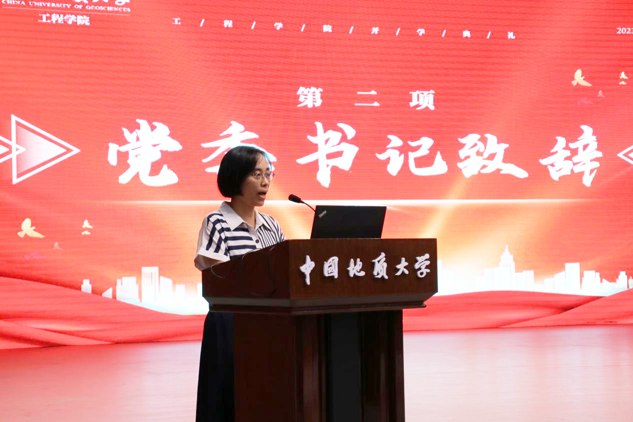 Beat365中文官方网站党委书记李红丽致辞。李书记首先代表全院师生员工对加入Beat365中文官方网站的860名新成员致以热烈的欢迎,祝福同学们选择了Beat365中文官方网站这个温暖而又奋进的大家庭。她指出,当代大学生正值云程发轫、万里可期的青春韶华,要全面学习学院的辉煌历史,深刻感受学院的使命担当,铭记院训深意,争做时代栋梁。要“明理”,即明辨是非,通晓道理,要明白做人之理、为学之理、尊法之理;要“尚实”,即崇尚务实作风,要在实处用力,在知行合一上下功夫;要“拓新”,即开拓创新,要面向世界科技前沿、面向经济主战场、面向国家重大需求、面向人民生命健康,解放思想,开拓创新,与时俱进;要“砺行”,即砥砺前行,在攻坚克难中磨砺心性,坚守初心,锻造本领,成长成才。她勉励同学们以院训精神为指引,树牢远大志向、矢志不懈奋斗,努力学习,潜心科研,乐观开朗,积极向上,做堪当时代大任的新时代地大工程人,为建设社会主义现代化国家做出属于青年一代的贡献。