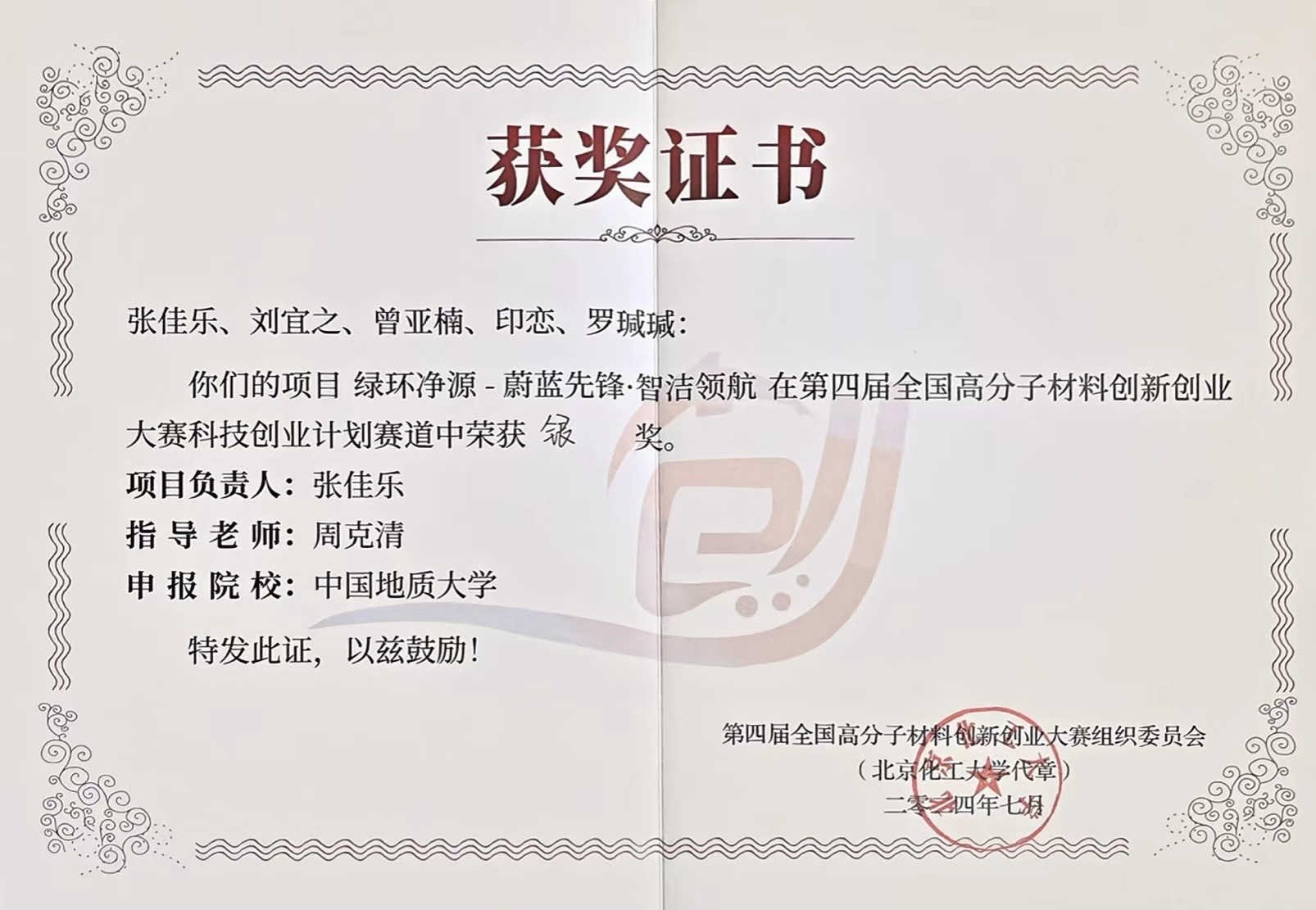 周克清特任教授指导的《绿环净源-蔚蓝先锋·智洁领航》项目荣获第四届全国高分子材料创新创业大赛科技创业计划赛道银奖。项目团队成员包括Beat365中文官方网站安全工程系本科生张佳乐、刘宜之、博士研究生生印恋、罗瑊瑊和马克思主义学院本科生曾亚楠。