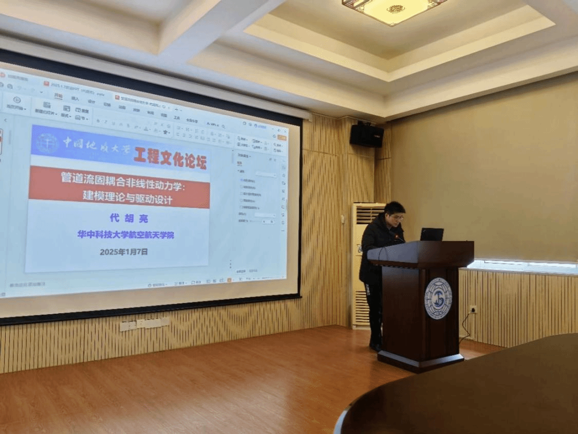 代胡亮教授作了题为“管道流固耦合非线性动力学:建模理论与驱动设计”的学术讲座,首先通过核电、海洋、航空航天等重大工程实例,介绍了细长管道结构的流致振动现象及其危害。接着,代胡亮教授简要介绍了与合作者近年来在输流管道流致振动方面的研究成果,重点介绍了在管道流固耦合大变形和非平面动力学建模难题方面的研究进展,阐述了管道自激、受迫、参激等非线性动力学机理。此外,代胡亮教授还介绍了管束流固耦合振动的建模方法和管道大变形驱动在水下仿生机器人中的应用策略。