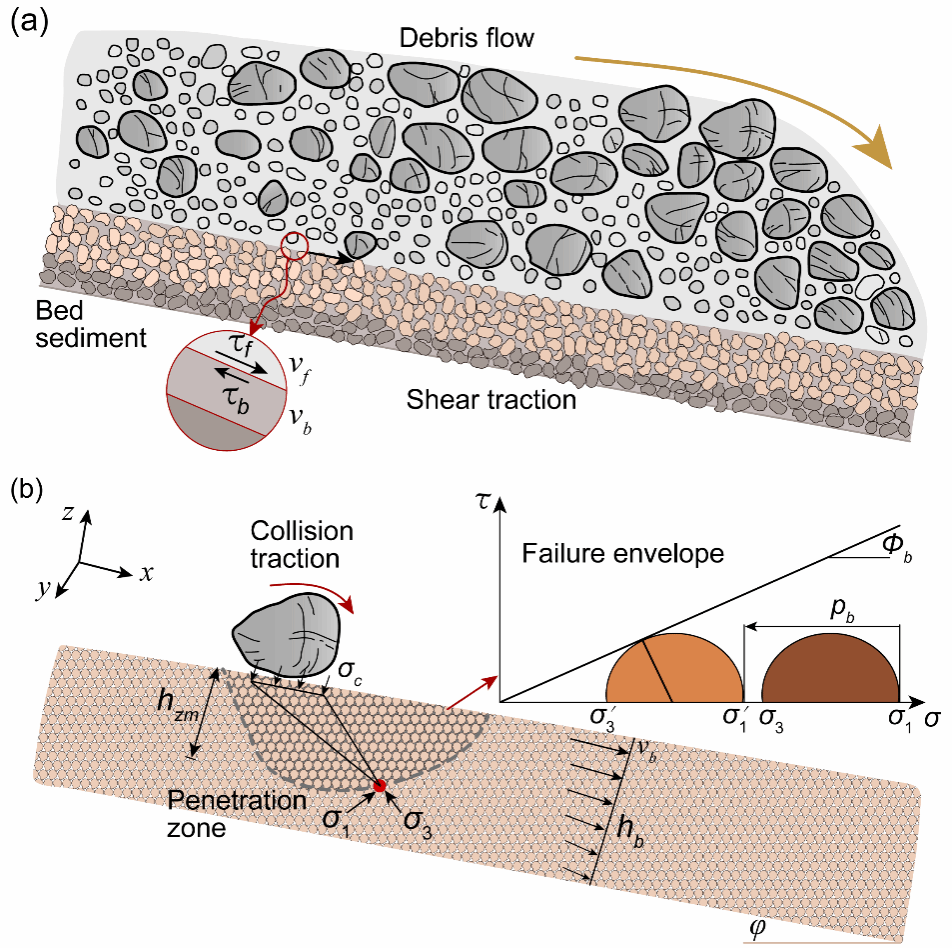 针对这一问题,郑鸿超特任教授基于Coulomb准则建立了考虑基底剪应力、碰撞应力和基床孔隙流体压力发展的泥石流侵蚀力学模型,并通过室内试验和Illgraben流域实测数据验证了该模型的有效性。结果表明:(1)对于潮湿沟床,由于高孔隙流体压力的发展,基底剪切和碰撞应力共同控制着泥沙侵蚀;对于干燥沟床,仅碰撞应力对泥沙侵蚀起控制作用,根本原因在于基底剪应力不足以克服剪切阻力;(2)对于剪切驱动的侵蚀沟床,孔隙流体压力通过降低剪切阻力促进侵蚀;对于碰撞驱动的侵蚀沟床,孔隙流体压力则通过增加其劈裂深度促进侵蚀。