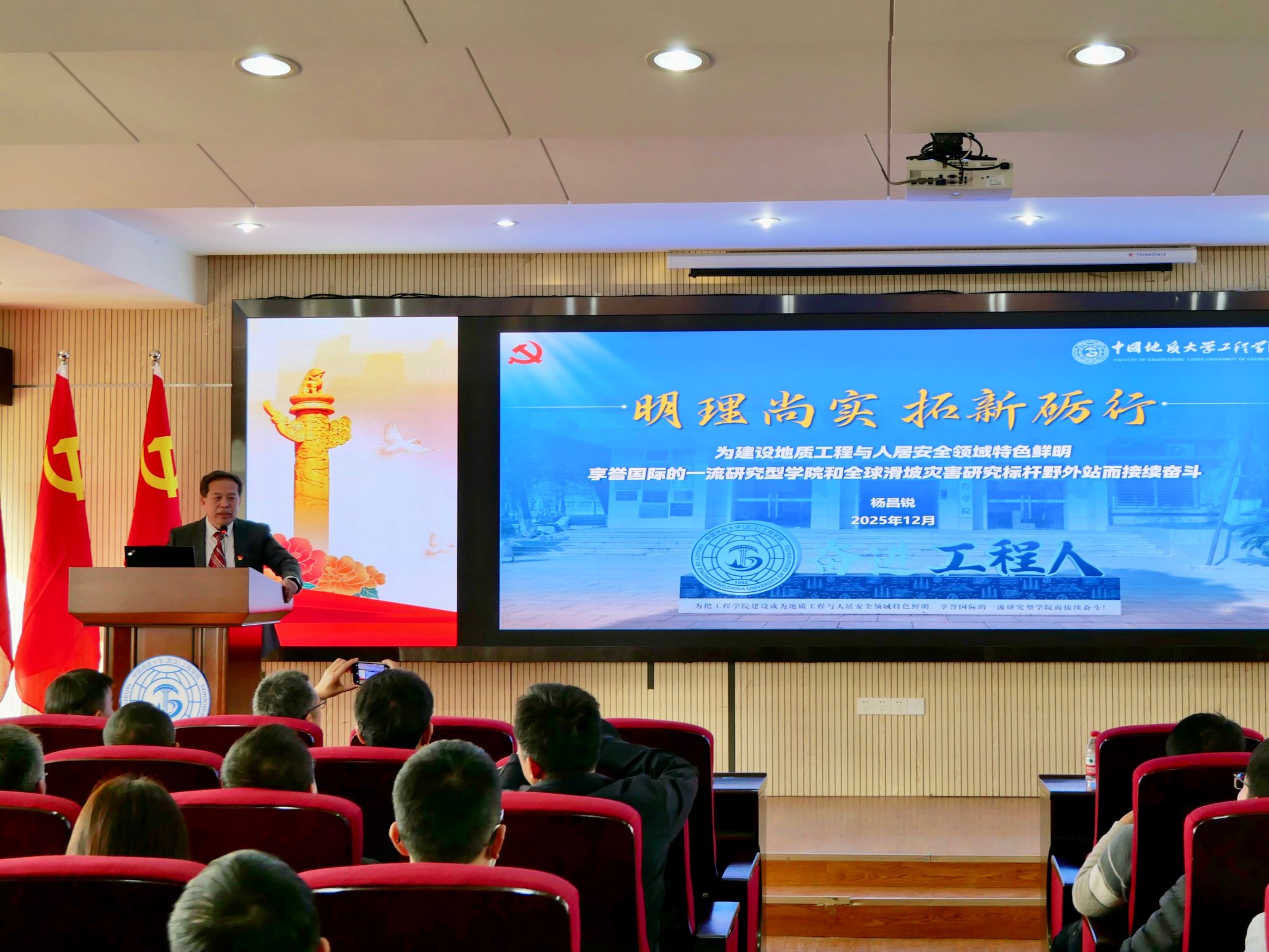 学院党委书记杨昌锐代表第四届党委会作题为《开拓创新 砥砺奋进 为建设地质工程与人居安全领域特色鲜明、享誉国际的一流研究型学院和全球滑坡灾害研究标杆野外站而接续奋斗》的工作报告。