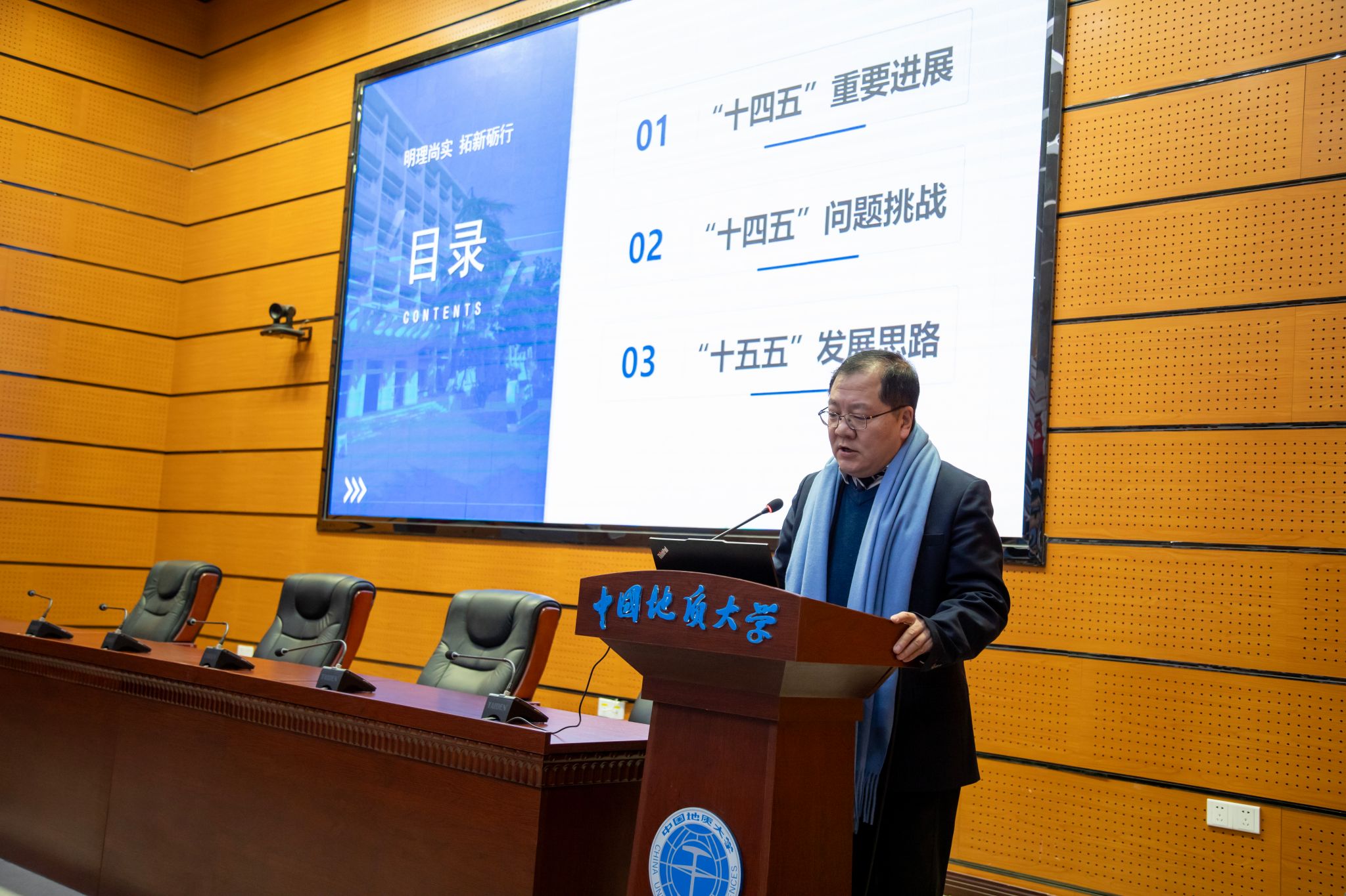 大会在雄壮的国歌声中拉开帷幕,全体教师身披“工程蓝”围巾肃立高歌,围巾垂落的流苏随铿锵节奏轻扬,跃动的蓝色波涛如学科底蕴般厚重,成为冬日里最温暖而庄严的学院图腾。随后,校工会副主席徐家忠同志宣读了校工会批复文件。