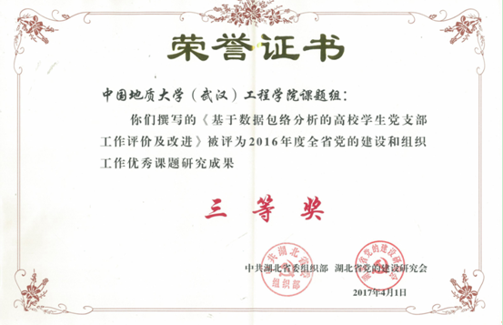 (通讯员:文新)近日,中共湖北省委组织部、省党建研究会公布了《关于表彰2016年度全省党的建设和组织工作优秀课题研究成果的通知》(鄂组通〔2017〕10号),我院由江广长、李少杰、丁继国完成的《基于数据包络分析的高校学生党支部工作评价及改进》课题获评三等奖。